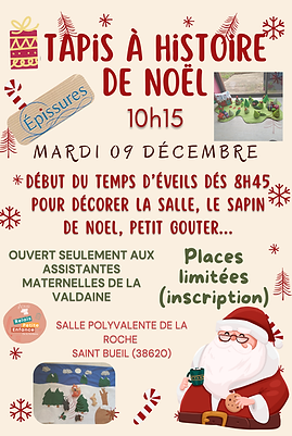 Matinée NOËL à l'école le lundi 16 décembre 2024 : (9h15-10h45 découverte de leur classe, jeux libres.. avec spectacle de Noel "Miette et Compagnie" à 9h45)